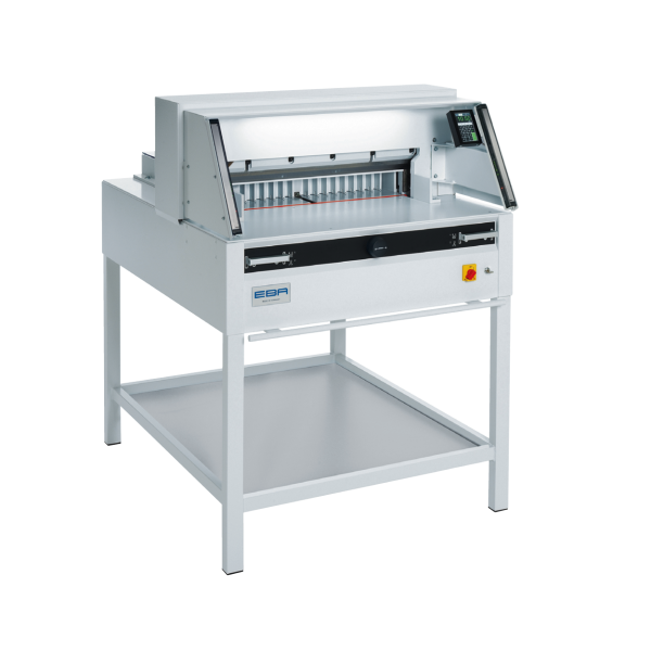 Professional guillotine with EASY-CUT, automatic clamp, programmable power backgauge with touch pad and IR light beam safety curtain on the front table.