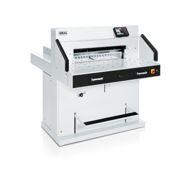 Our top model: guillotine with EASY-CUT, hydraulic clamp, programmable power backgauge with electronic control module and IR light beam safety curtain on the front table.